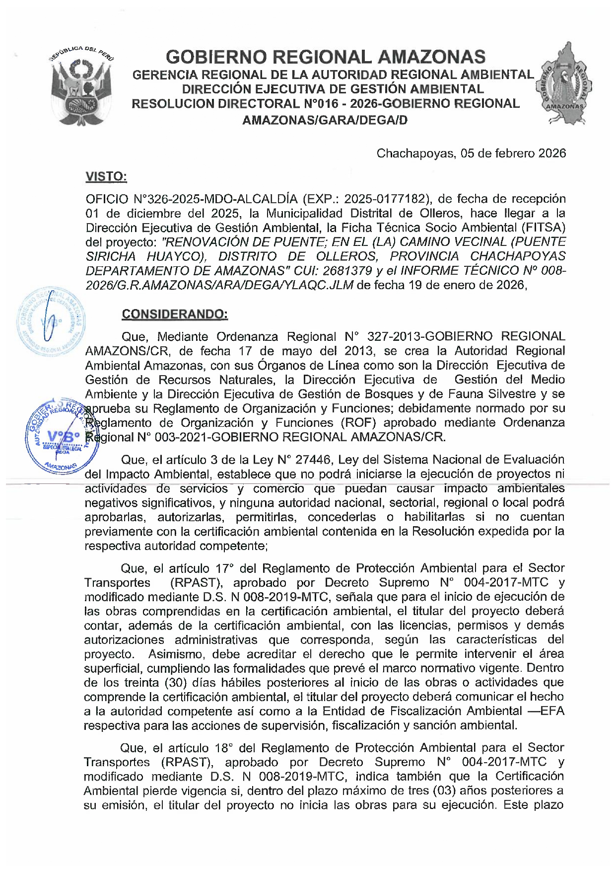 Esta Resolución Directoral tiene como antecedente al OFICIO Nº 326-2025-MDO-ALCALDIA (EXP: 2025-0177182) de fecha de recepción de 01 de diciembre del 2025, presentado por la Municipalidad Distrital de San Olleros, el cual hizo llegar a la Dirección Ejecutiva de Gestión Ambiental (DEGA) del Gobierno Regional Amazonas la Ficha Técnica Socio Ambiental (FITSA) para el proyecto: "RENOVACIÓN DE PUENTE; EN EL (LA) CAMINO VECINAL PUENTE SIRICHA HUAYCO, DISTRITO DE OLLEROS, PROVINCIA DE CHACHAPOYAS, DEPARTAMENTO DE AMAZONAS”. El proyecto cuenta con el Código Único de Inversiones (CUI) 2681379.