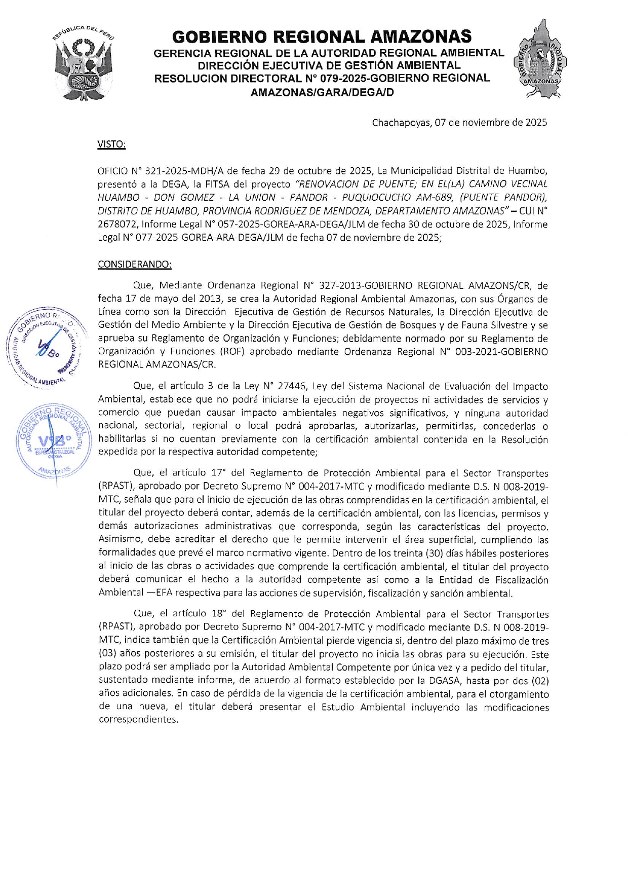 Esta Resolución Directoral tiene como antecedente al OFICIO Nº 321-2025-MDH/A, presentado por la Municipalidad Distrital de Huambo, el cual hizo llegar a la Dirección Ejecutiva de Gestión Ambiental (DEGA) del Gobierno Regional Amazonas la Ficha Técnica Socio Ambiental (FITSA) para el proyecto: "Renovación de Puente; en el(la) Camino Vecinal - Huambo, don Gómez - La Unión – Pandor – Puquiocucho AM-689, (Puente Pandor), Distrito de Huambo, Provincia de Rodríguez de Mendoza, Departamento Amazonas". El proyecto cuenta con el Código Único de Inversiones (CUI) 2678072.
