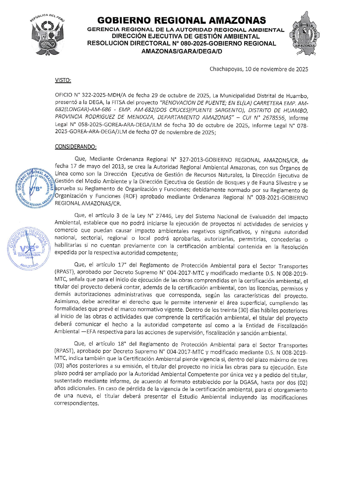 Esta Resolución Directoral tiene como antecedente al OFICIO Nº 322-2025-MDH/A, presentado por la Municipalidad Distrital de Huambo, el cual hizo llegar a la Dirección Ejecutiva de Gestión Ambiental (DEGA) del Gobierno Regional Amazonas la Ficha Técnica Socio Ambiental (FITSA) para el proyecto: "Renovación de Puente; en el(la) Carretera EMP. AM-682 (Longar)-AM-686 – EMP. AM-682(Dos Cruces) (Puente Sargento), Distrito de Huambo, Provincia de Rodríguez de Mendoza, Departamento Amazonas". El proyecto cuenta con el Código Único de Inversiones (CUI) 2678556.