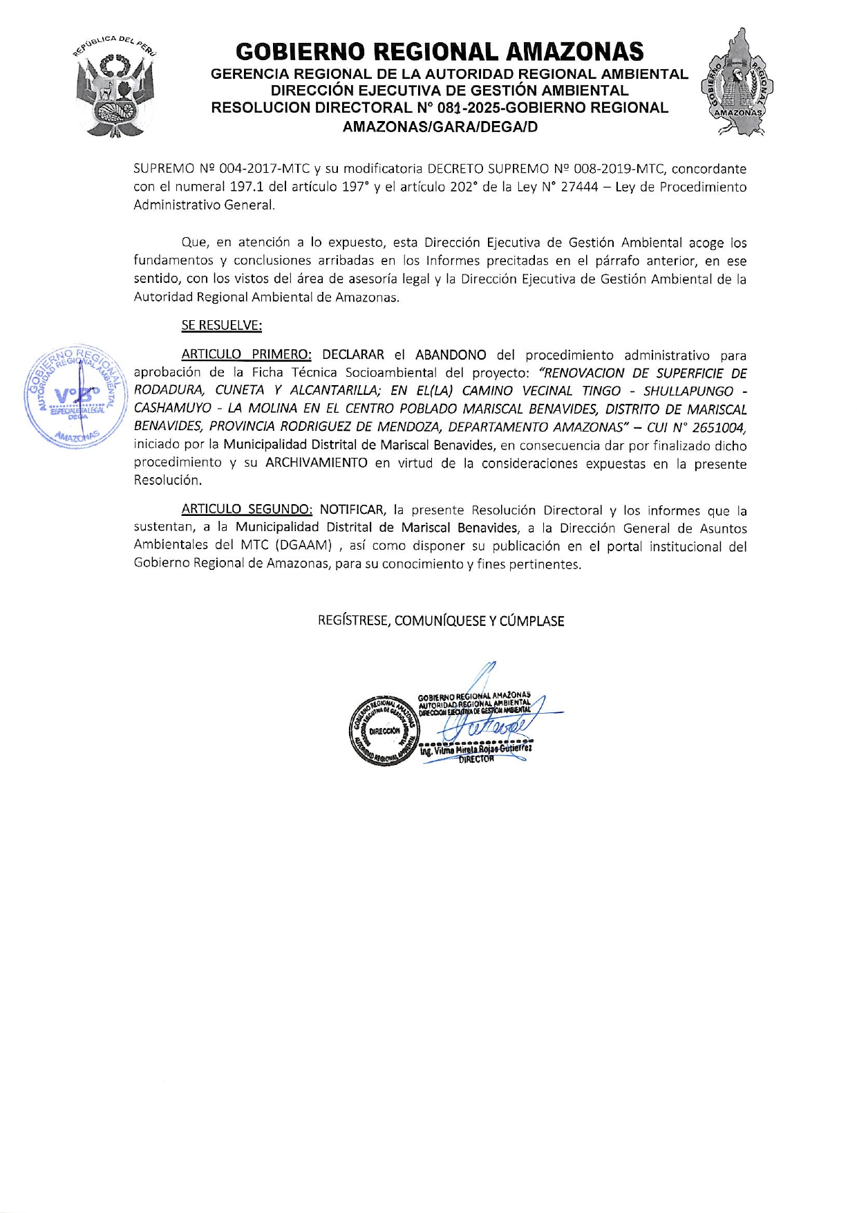 Esta Resolución Directoral tiene como antecedente al OFICIO Nº 471-2025-MDMB/ALCALDIA, presentado por la Municipalidad Distrital de Mariscal Benavides, el cual hizo llegar a la Dirección Ejecutiva de Gestión Ambiental (DEGA) del Gobierno Regional Amazonas la Ficha Técnica Socio Ambiental (FITSA) para el proyecto: "Renovación de Superficie de Rodadura, Cuneta y Alcantarillado; en el (LA) camino vecinal Tingo – Shullapungo – Cashamuyo – la Molina en el centro poblado Mariscal Benavides, Distrito Mariscal Benavides, Provincia de Rodríguez de Mendoza, Departamento Amazonas”. El proyecto cuenta con el Código Único de Inversiones (CUI) 2651004.