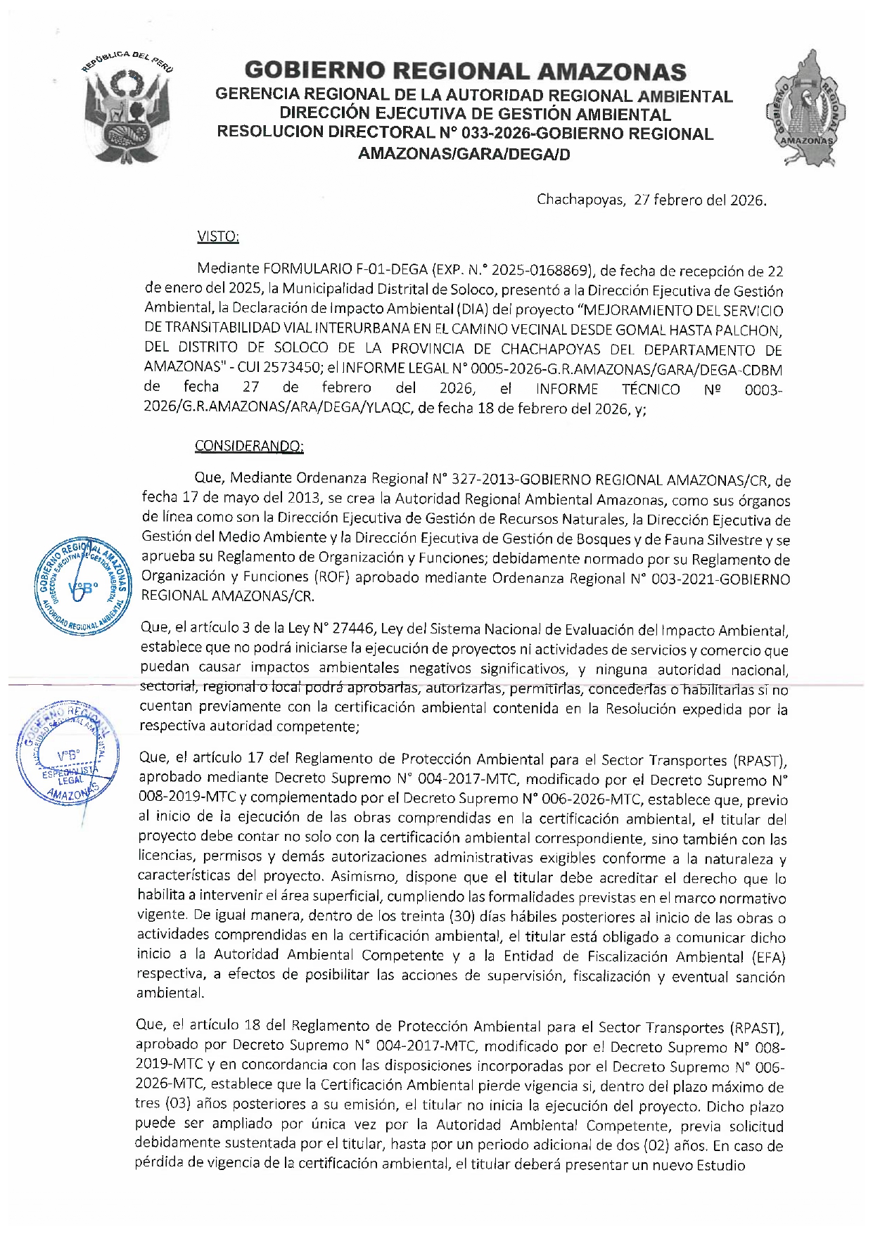 Esta Resolución Directoral tiene como antecedente al OFICIO Nº 220-2025-GOB.REG.AMAZONAS/GSRC el Gobierno Regional Amazonas, el cual hizo llegar a la Dirección Ejecutiva de Gestión Ambiental (DEGA) del Gobierno Regional Amazonas la Declaración de Impacto Ambiental (DIA) del proyecto: ADICIONAL N° 01 VINCULANTE DE OBRA; “CREACIÓN DE LOS SERVICIOS DE TRANSITABILIDAD ENTRE LAS COMUNIDADES NATIVAS PEAS Y SEASME, DISTRITO DE NIEVA, PROVINCIA DE CONDORCANQUI, REGIÓN AMAZONAS”. El proyecto cuenta con el Código Único de Inversiones (CUI) 2378153.
