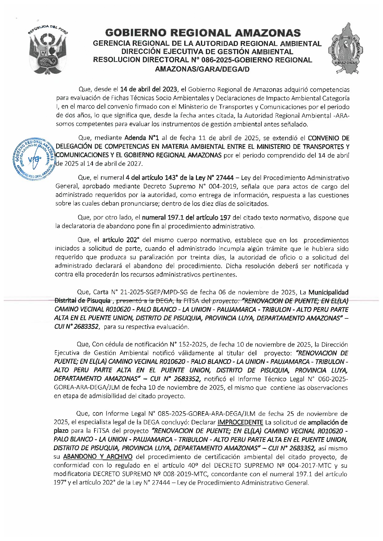 Esta Resolución Directoral tiene como antecedente a la CARTA Nº 21-2025-SGEP/MPD-SG, presentado por la Municipalidad Distrital de Pisuquia, el cual hizo llegar a la Dirección Ejecutiva de Gestión Ambiental (DEGA) del Gobierno Regional Amazonas la Ficha Técnica Socio Ambiental (FITSA) para el proyecto: "Renovación de Puente, en El(La) Camino Vecinal R010620 – Palo Blanco - La Unión – Paujamarca – Tribulon – Alto Perú parte Alta en el Puente Unión, Distrito de Pisuquia, Provincia de Luya, Departamento Amazonas”. El proyecto cuenta con el Código Único de Inversiones (CUI) 2683352.