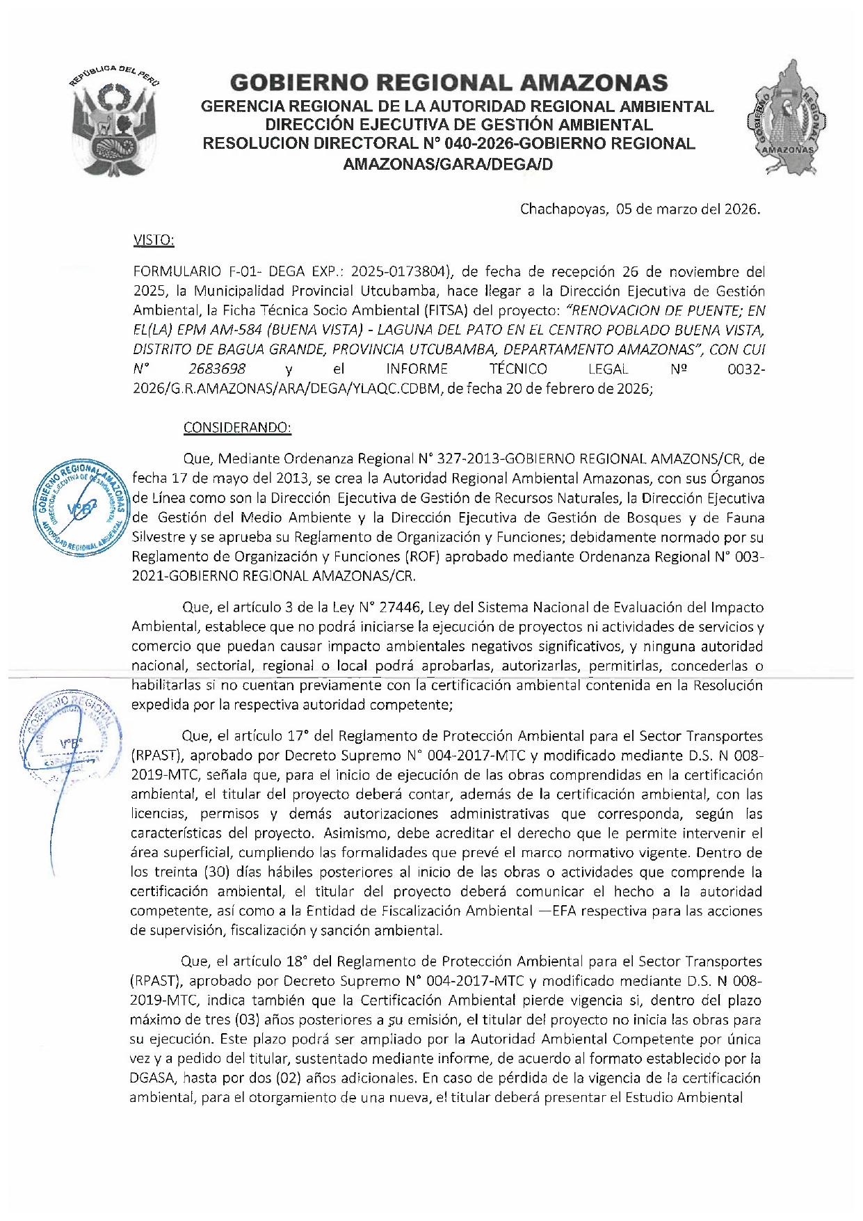 Esta Resolución Directoral tiene como antecedente al FORMULARIO F-01-DEGA (Exp. 2025-0173804), presentado por la Municipalidad Distrital de Bagua Grande, el cual hizo llegar a la Dirección Ejecutiva de Gestión Ambiental (DEGA) del Gobierno Regional Amazonas la Ficha Técnica Socio Ambiental (FITSA) para el proyecto: "RENOVACIÓN DE PUENTE; EN EL (LA) EPM AM-584 (BUENA VISTA) – LAGUNA DEL PATO EN EL CENTRO POBLADO BUENA VISTA, DISTRITO DE BAGUA GRANDE, PROVINCIA DE UTCUBAMBA, DEPARTAMENTO DE AMAZONAS”. El proyecto cuenta con el Código Único de Inversiones (CUI) 2683698.