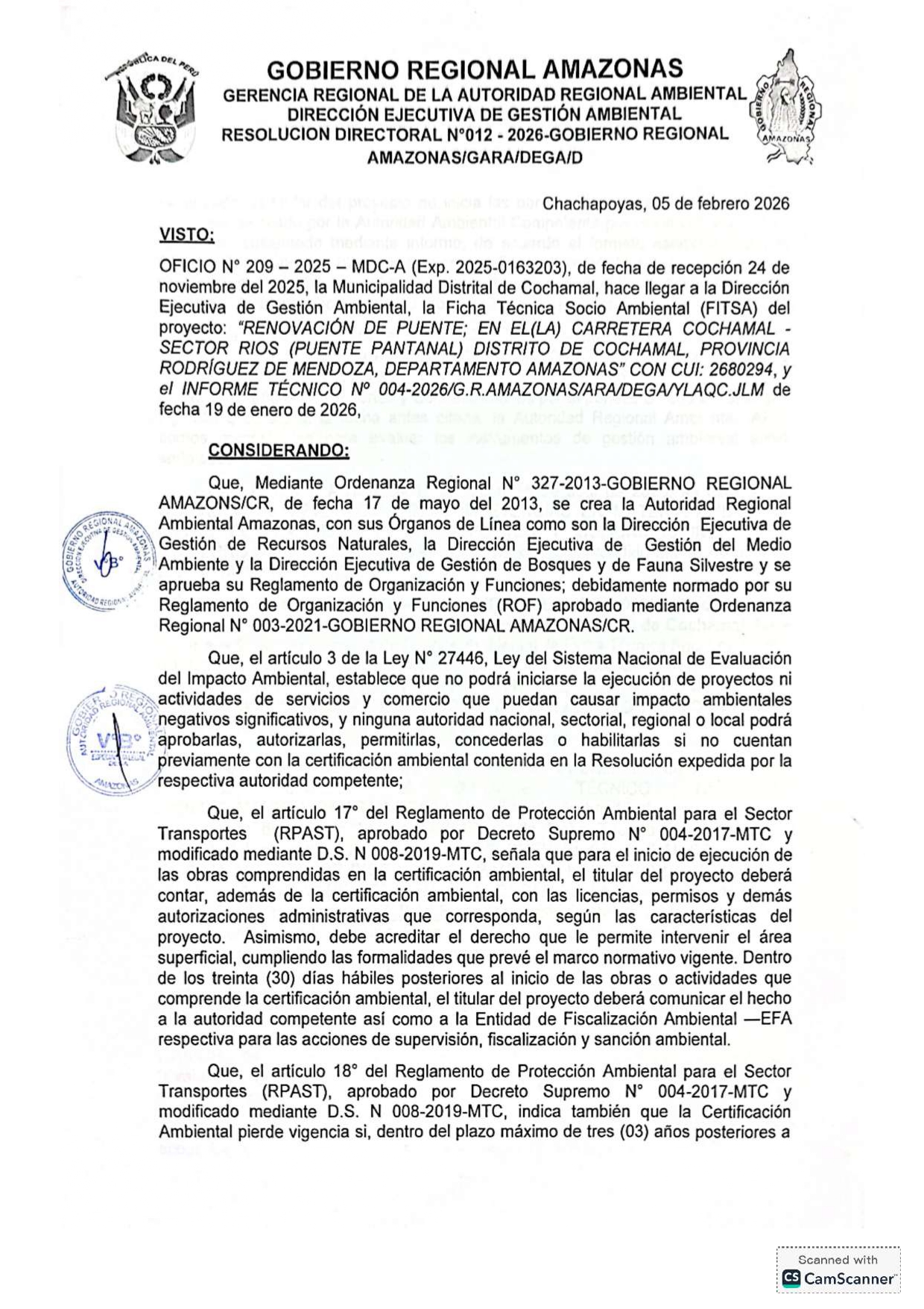 Esta Resolución Directoral tiene como antecedente al OFICIO Nº 209 – 2025 – MDC-A (EXP: 2025-0163203) de fecha de recepción de 24 de noviembre del 2025, presentado por la Municipalidad Distrital de Cochamal, el cual hizo llegar a la Dirección Ejecutiva de Gestión Ambiental (DEGA) del Gobierno Regional Amazonas la Ficha Técnica Socio Ambiental (FITSA) para el proyecto: "RENOVACIÓN DE PUENTE, EN EL (LA) CARRETERA COCHAMAL – SECTOR RÍOS (PUENTE PANTANAL) DISTRITO DE COCHAMAL, PROVINCIA DE RODRÍGUEZ DE MENDOZA, DEPARTAMENTO AMAZONAS”. El proyecto cuenta con el Código Único de Inversiones (CUI) 2680294.