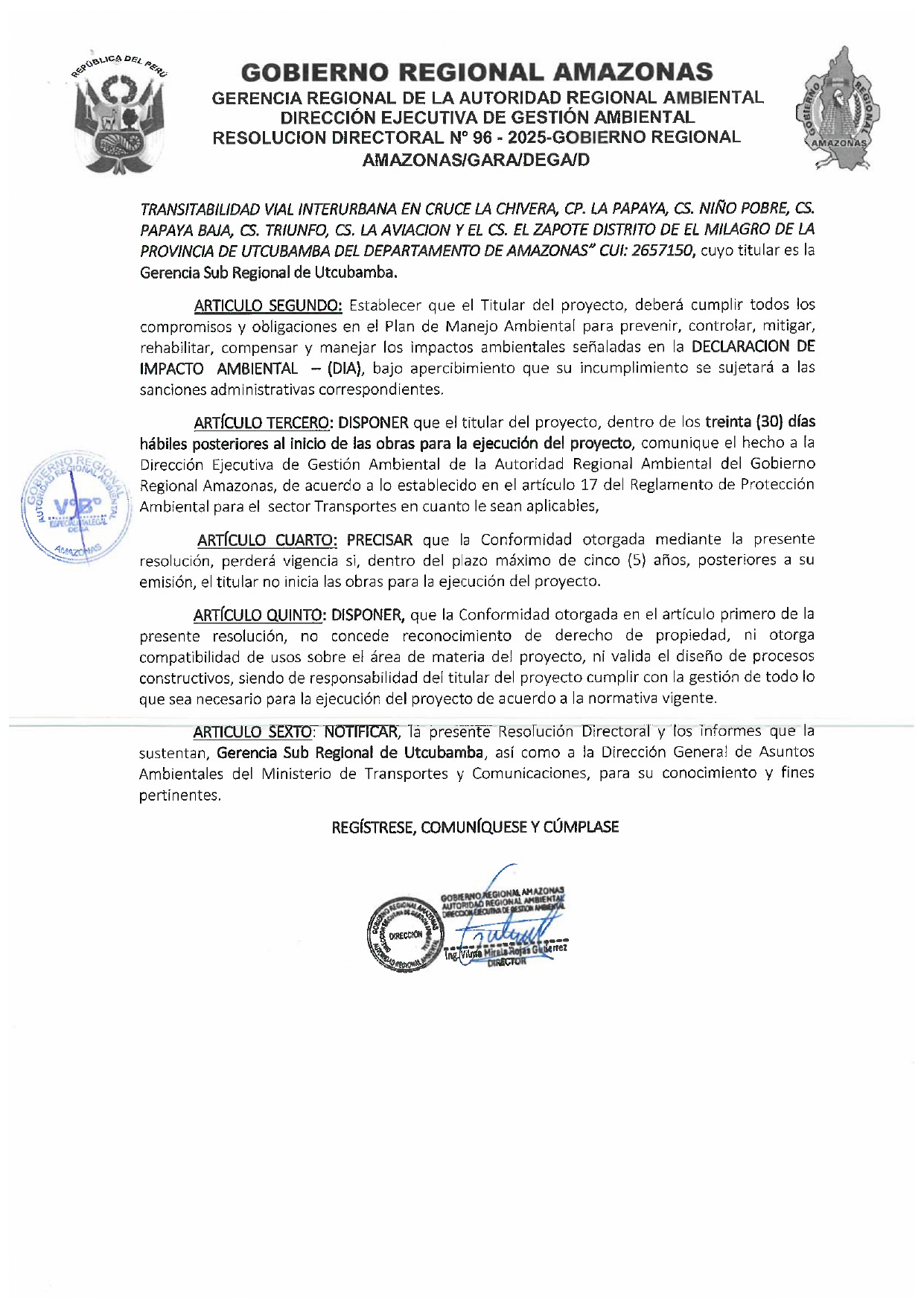 Esta Resolución Directoral tiene como antecedente al OFICIO Nº 000977-2025-G.R.AMAZONAS/GSRU (exp. 2025-0184364), presentado por la Gerencia Sub Regional Utcubamba, el cual hizo llegar a la Dirección Ejecutiva de Gestión Ambiental (DEGA) del Gobierno Regional Amazonas la Declaración de Impacto Ambiental (DIA) para el proyecto: "MEJORAMIENTO Y AMPLIACIÓN DEL SERVICIO DE TRANSITABILIDAD VIAL INTERURBANA EN EL CRUCE LA CHIVERA, CP. LA PAPAYA, CS. NIÑO POBRE, CS. PAPAYA BAJA, CS. TRIUNFO, CS. LA AVIACIÓN Y EL CS. EL ZAPOTE, DISTRITO DE EL MILAGRO, PROVINCIA DE UTCUBAMBA, DEPARTAMENTO DE AMAZONAS". El proyecto cuenta con el Código Único de Inversiones (CUI) 2657150.