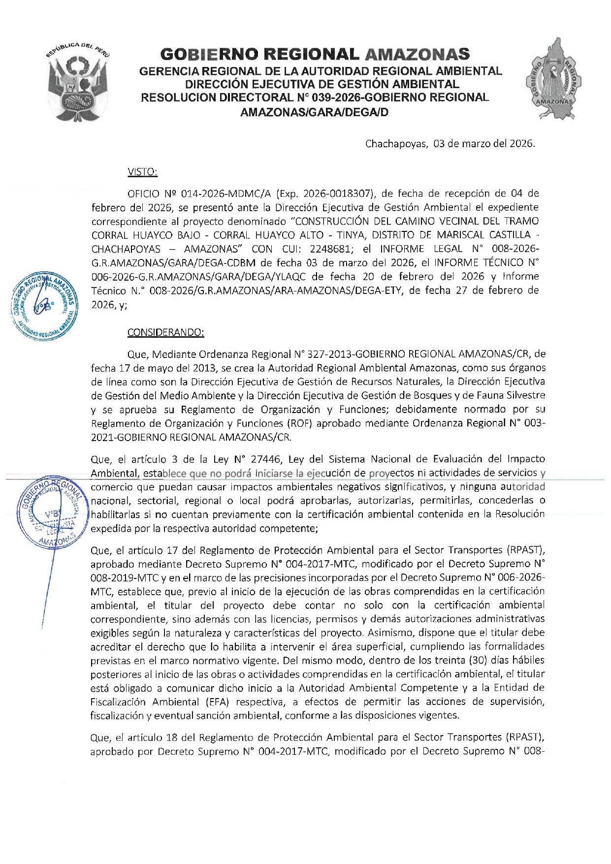 Esta Resolución Directoral tiene como antecedente al OFICIO N° 014-2026-MDMC/A (Exp. 2026-0018307), presentado por la Municipalidad Distrital de Mariscal Castilla, el cual hizo llegar a la Dirección Ejecutiva de Gestión Ambiental (DEGA) del Gobierno Regional Amazonas la Ficha Técnica Socio Ambiental (FITSA) para el proyecto: "CONSTRUCCIÓN DEL CAMINO VECINAL DEL TRAMO CORRAL HUAYCO BAJO – CORRAL HUAYCO ALTO – TINYA, DISTRITO DE MARISCAL CASTILLA – CHACHAPOYAS - AMAZONAS”. El proyecto cuenta con el Código Único de Inversiones (CUI) 2248681.