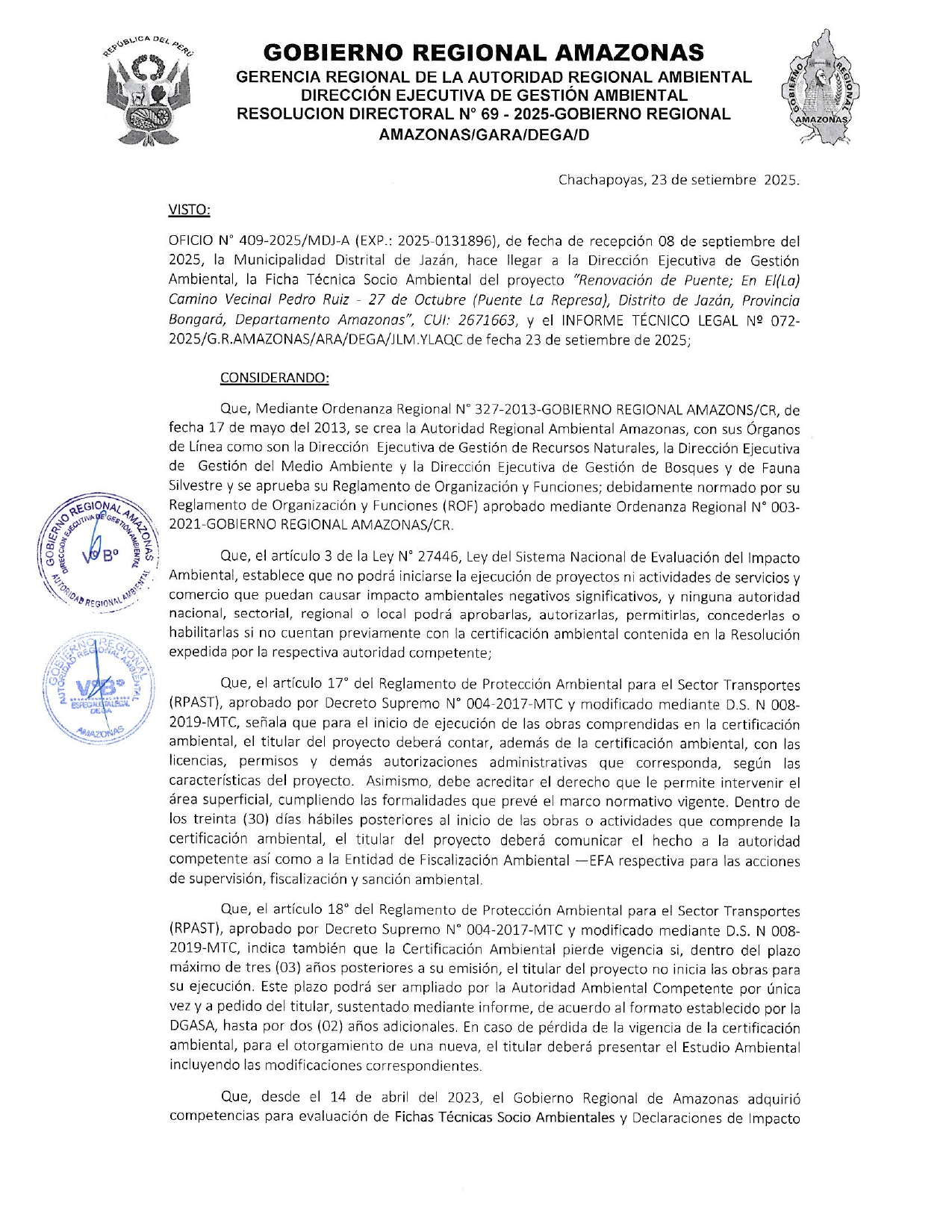 Esta Resolución Directoral tiene como antecedente el Oficio N° 409-2025/MDJ-A, presentado por la Municipalidad Distrital de Jazán, el cual hizo llegar a la Dirección Ejecutiva de Gestión Ambiental (DEGA) del Gobierno Regional Amazonas la Ficha Técnica Socio Ambiental (FITSA) para el proyecto: " Renovación de Puente; en el (La) Camino Vecinal Pedro Ruíz – 27 de Octubre (Puente la Represa), Distrito de Jazán, Provincia de Bogará, Departamento Amazonas". El proyecto cuenta con el Código Único de Inversiones (CUI) 2671663.