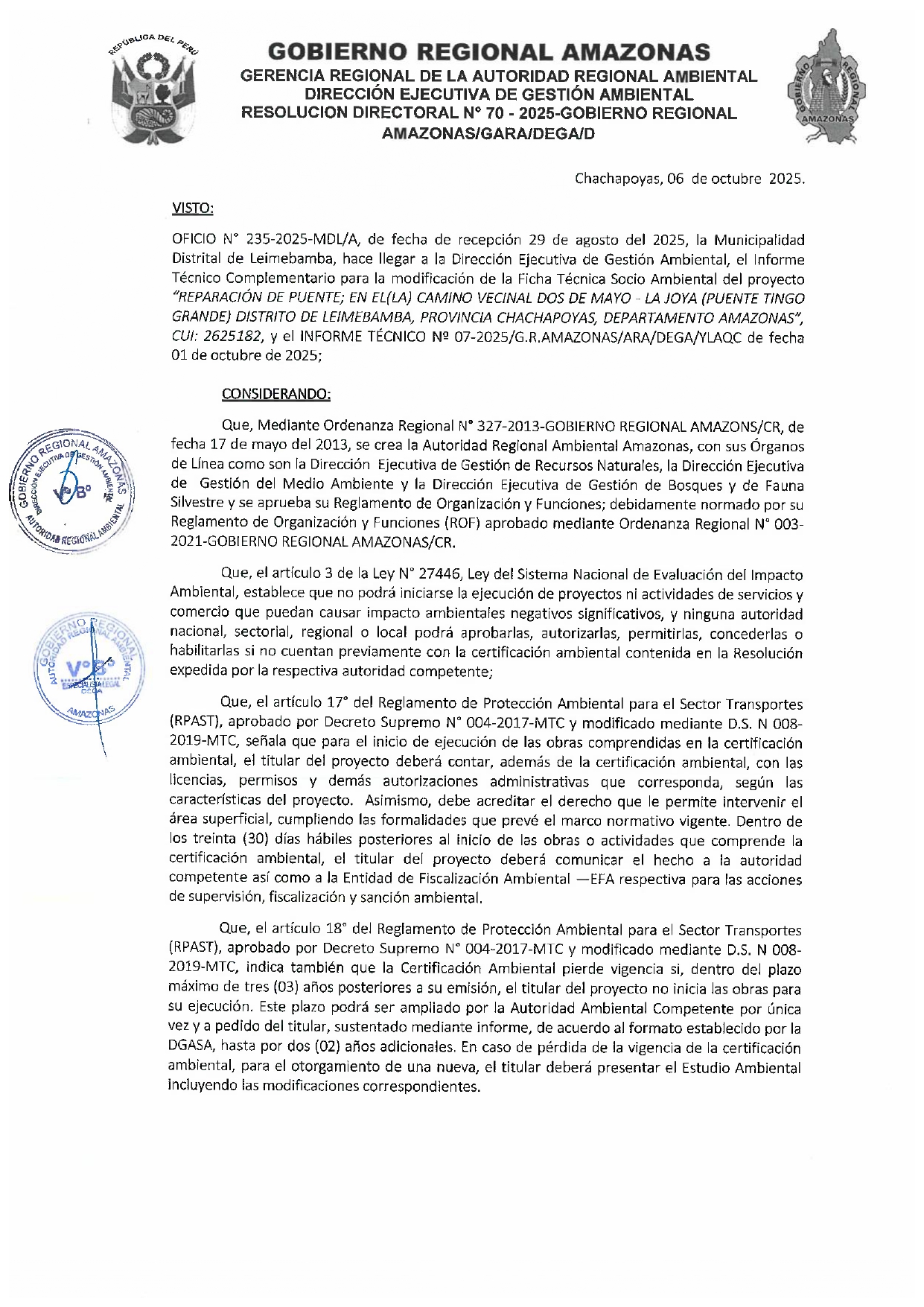 Esta Resolución Directoral tiene como antecedente el Oficio N° 235-2025/MDL-A, presentado por la Municipalidad Distrital de Leimebamba, el cual hizo llegar a la Dirección Ejecutiva de Gestión Ambiental (DEGA) del Gobierno Regional Amazonas la Ficha Técnica Socio Ambiental (FITSA) para el proyecto: " Reparación de Puente; en el (La) Camino Vecinal Dos de Mayo – La Joya (Puente Tingo Grande), Distrito de Leimebamba, Provincia de Chachapoyas, Departamento Amazonas". El proyecto cuenta con el Código Único de Inversiones (CUI) 2625182.