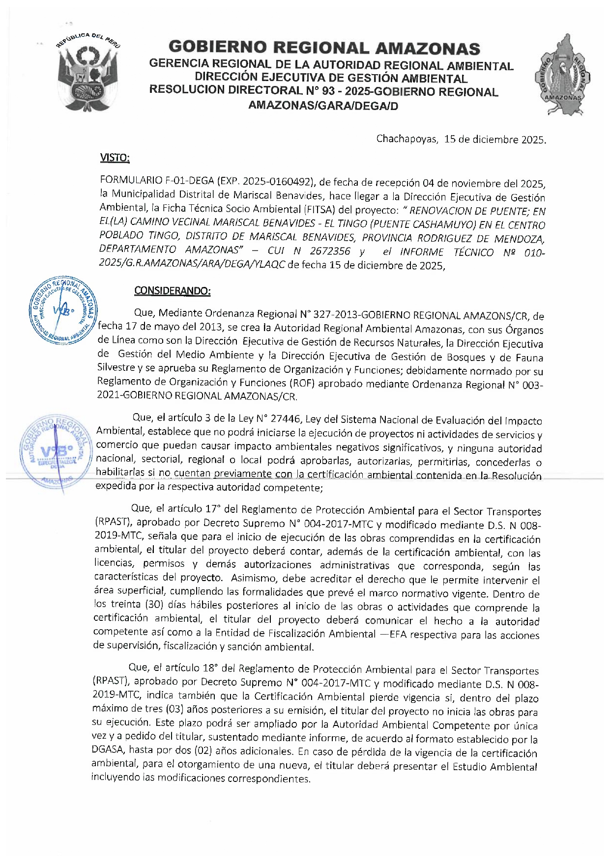 Esta Resolución Directoral tiene como antecedente al FORMULARIO Nº F-01-DEGA, (EXP.2025-0160492) presentado por la Municipalidad Distrital de Mariscal Benavides, el cual hizo llegar a la Dirección Ejecutiva de Gestión Ambiental (DEGA) del Gobierno Regional Amazonas la Ficha Técnica Socio Ambiental (FITSA) para el proyecto: "Renovación de Puente; en El(La) Camino Vecinal Mariscal Benavides – el Tingo (Puente Cashamuyo) en el Centro Poblado Tingo, Distrito de Mariscal Benavides, Provincia Rodríguez de Mendoza, Departamento de Amazonas”. El proyecto cuenta con el Código Único de Inversiones (CUI) 2672356.