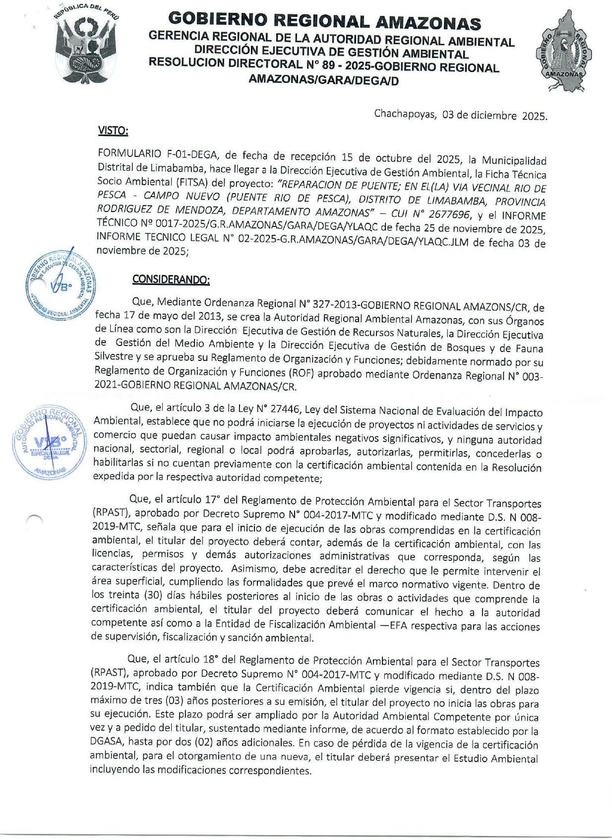 Esta Resolución Directoral tiene como antecedente al FORMULARIO F-01-DEGA, presentado por la Municipalidad Distrital de Limabamba, el cual hizo llegar a la Dirección Ejecutiva de Gestión Ambiental (DEGA) del Gobierno Regional Amazonas la Ficha Técnica Socio Ambiental (FITSA) para el proyecto: "REPARACIÓN DE PUENTE; EN EL(LA) VÍA VECINAL RIO DE PESCA – CAMPO NUEVO (PUENTE RIO DE PESCA), DISTRITO DE LIMABAMBA, PROVINCIA DE RODRÍGUEZ DE MENDOZA, DEPARTAMENTO DE AMAZONAS”. El proyecto cuenta con el Código Único de Inversiones (CUI) 2677696.