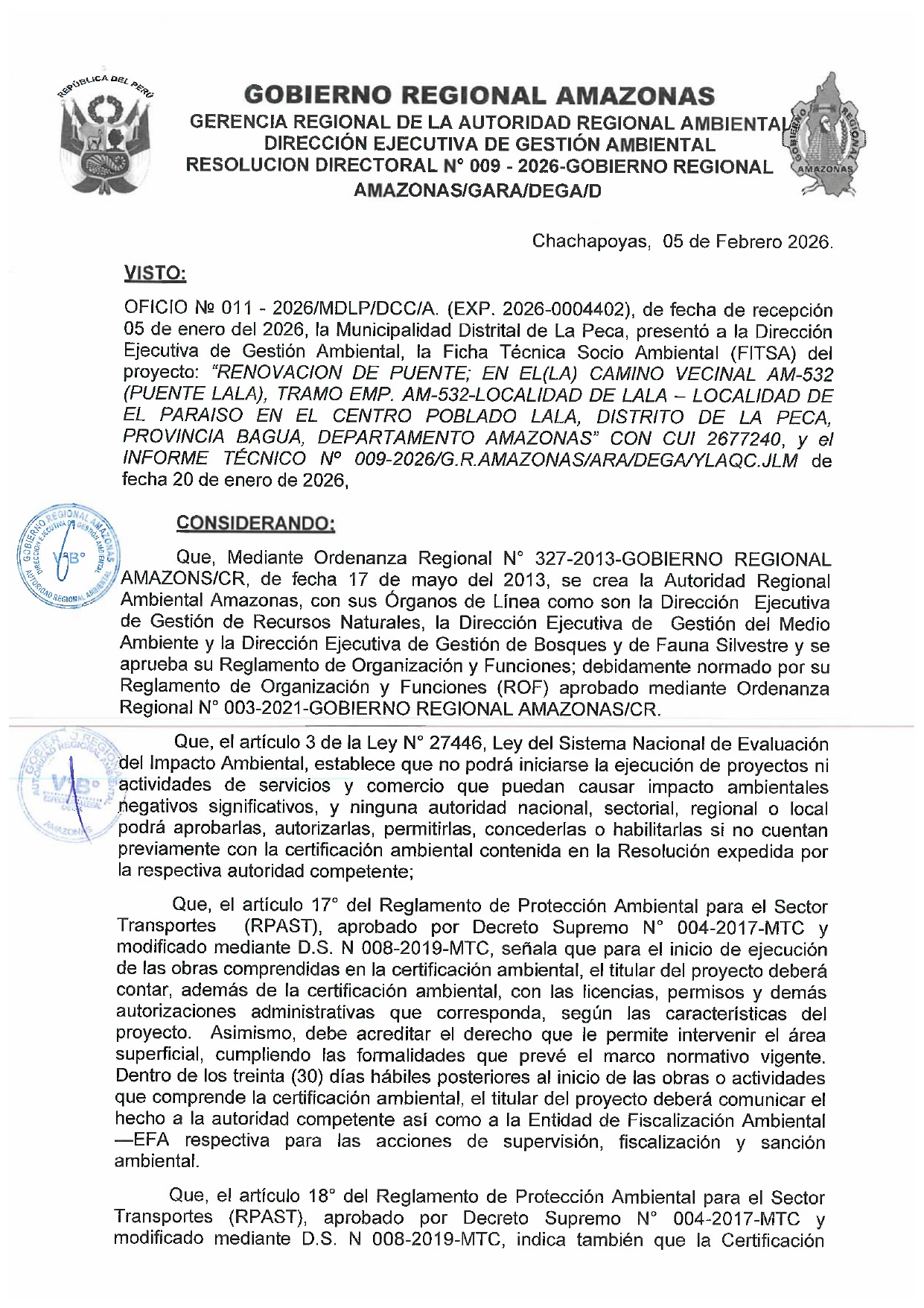 Esta Resolución Directoral tiene como antecedente al OFICIO Nº 011- 2026-MDLP/DCC/A. (Exp. 2026-0004402), presentado por la Municipalidad Distrital de la Peca, el cual hizo llegar a la Dirección Ejecutiva de Gestión Ambiental (DEGA) del Gobierno Regional Amazonas la Ficha Técnica Socio Ambiental (FITSA) para el proyecto: "RENOVACIÓN DE PUENTE; EN EL(LA) CAMINO VECINAL AM-532 (PUENTE LALA), TRAMO EMP. AM-532-LOCALIDAD DE LALA – LOCALIDAD DE EL PARAÍSO EN EL CENTRO POBLADO LALA, DISTRITO DE LA PECA, PROVINCIA DE BAGUA, DEPARTAMENTO DE AMAZONAS”. El proyecto cuenta con el Código Único de Inversiones (CUI) 2677240.