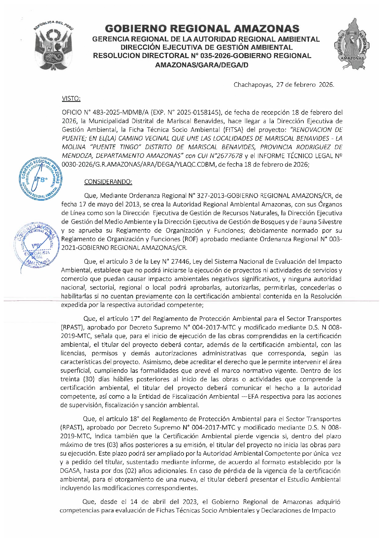 Esta Resolución Directoral tiene como antecedente al OFICIO Nº 483 - 2025-MDMB/A (Exp. 2025-0158145), presentado por la Municipalidad Distrital de Mariscal Benavides, el cual hizo llegar a la Dirección Ejecutiva de Gestión Ambiental (DEGA) del Gobierno Regional Amazonas la Ficha Técnica Socio Ambiental (FITSA) para el proyecto: "RENOVACIÓN DE PUENTE; EN EL (LA) CAMINO VECINAL QUE UNE LAS LOCALIDADES DE MARISCAL BENAVIDES – LA MOLINA PUENTE TINGO DISTRITO DE MARISCAL BENAVIDES, PROVINCIA DE RODRÍGUEZ DE MENDOZA, DEPARTAMENTO DE AMAZONAS”. El proyecto cuenta con el Código Único de Inversiones (CUI) 26777678.