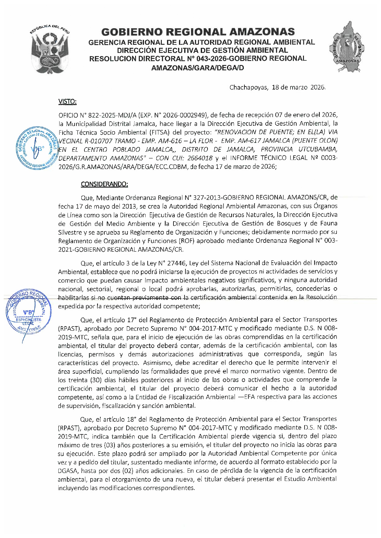 Esta Resolución Directoral tiene como antecedente al OFICIO Nº 822 - 2025-MDJ/A (Exp. 2026-0002949), presentado por la Municipalidad Distrital de Jamalca, el cual hizo llegar a la Dirección Ejecutiva de Gestión Ambiental (DEGA) del Gobierno Regional Amazonas la Ficha Técnica Socio Ambiental (FITSA) para el proyecto: "RENOVACIÓN DE PUENTE; EN EL (LA) VÍA VECINAL R-010707 TRAMO – EMP. AM-617 JAMALCA (PUENTE OLON) EN EL CENTRO POBLADO JAMALCA, DISTRITO DE JAMALCA, PROVINCIA DE UTCUBAMBA, DEPARTAMENTO DE AMAZONAS”. El proyecto cuenta con el Código Único de Inversiones (CUI) 2664018.
