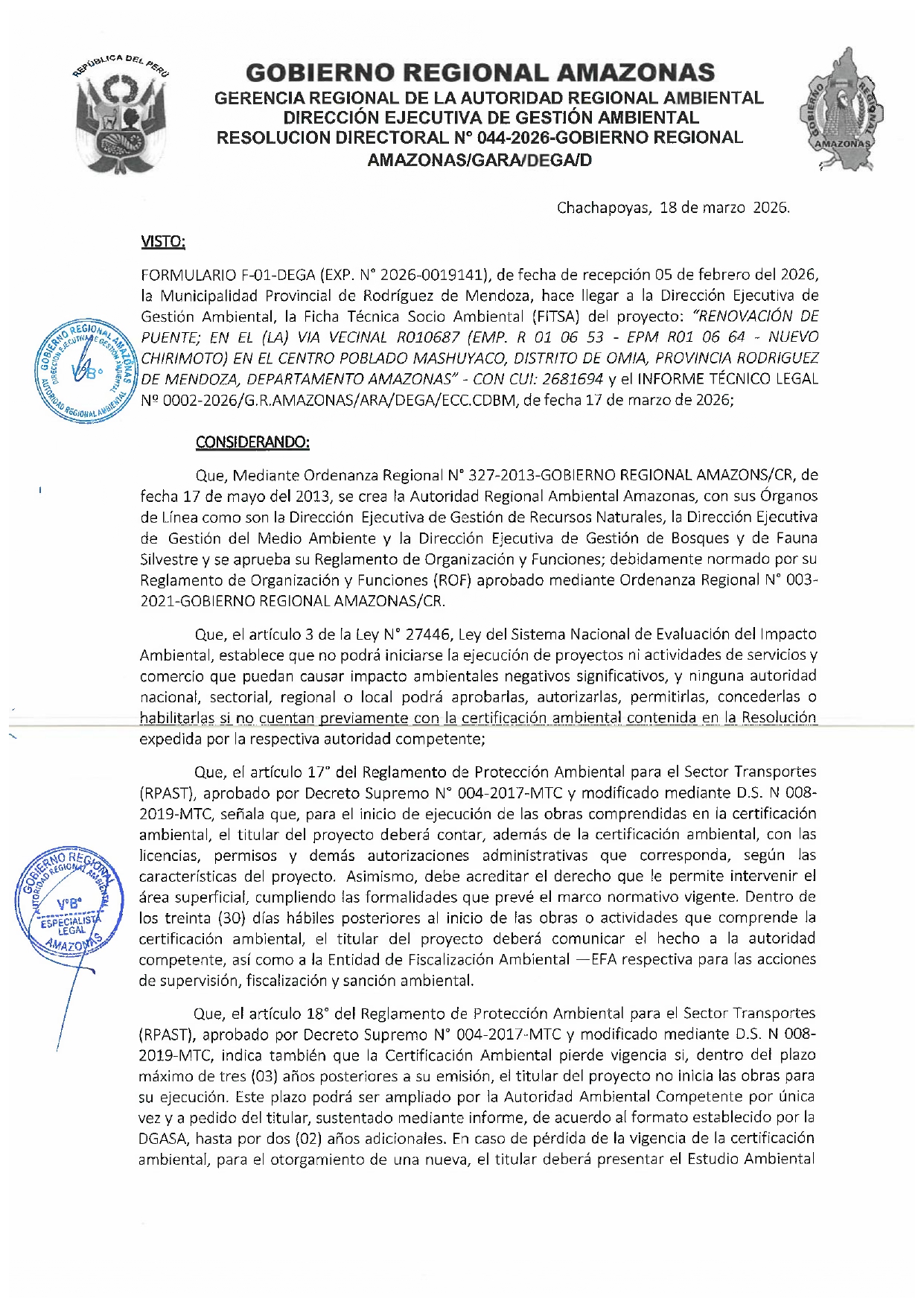 Esta Resolución Directoral tiene como antecedente al FORMULARIO F-01-DEGA (Exp. 2026-0019141), presentado por la Municipalidad Distrital de Omia, el cual hizo llegar a la Dirección Ejecutiva de Gestión Ambiental (DEGA) del Gobierno Regional Amazonas la Ficha Técnica Socio Ambiental (FITSA) para el proyecto: "RENOVACIÓN DE PUENTE; EN EL (LA) VÍA VECINAL R-010687 (EMP. R 01 06 53 – EPM R01 06 64 – NUEVO CHIRIMOTO) EN EL CENTRO POBLADO MASHUYACO, DISTRITO DE OMIA, PROVINCIA DE RODRIGUEZ DE MENDOZA, DEPARTAMENTO DE AMAZONAS”. El proyecto cuenta con el Código Único de Inversiones (CUI) 2681694.