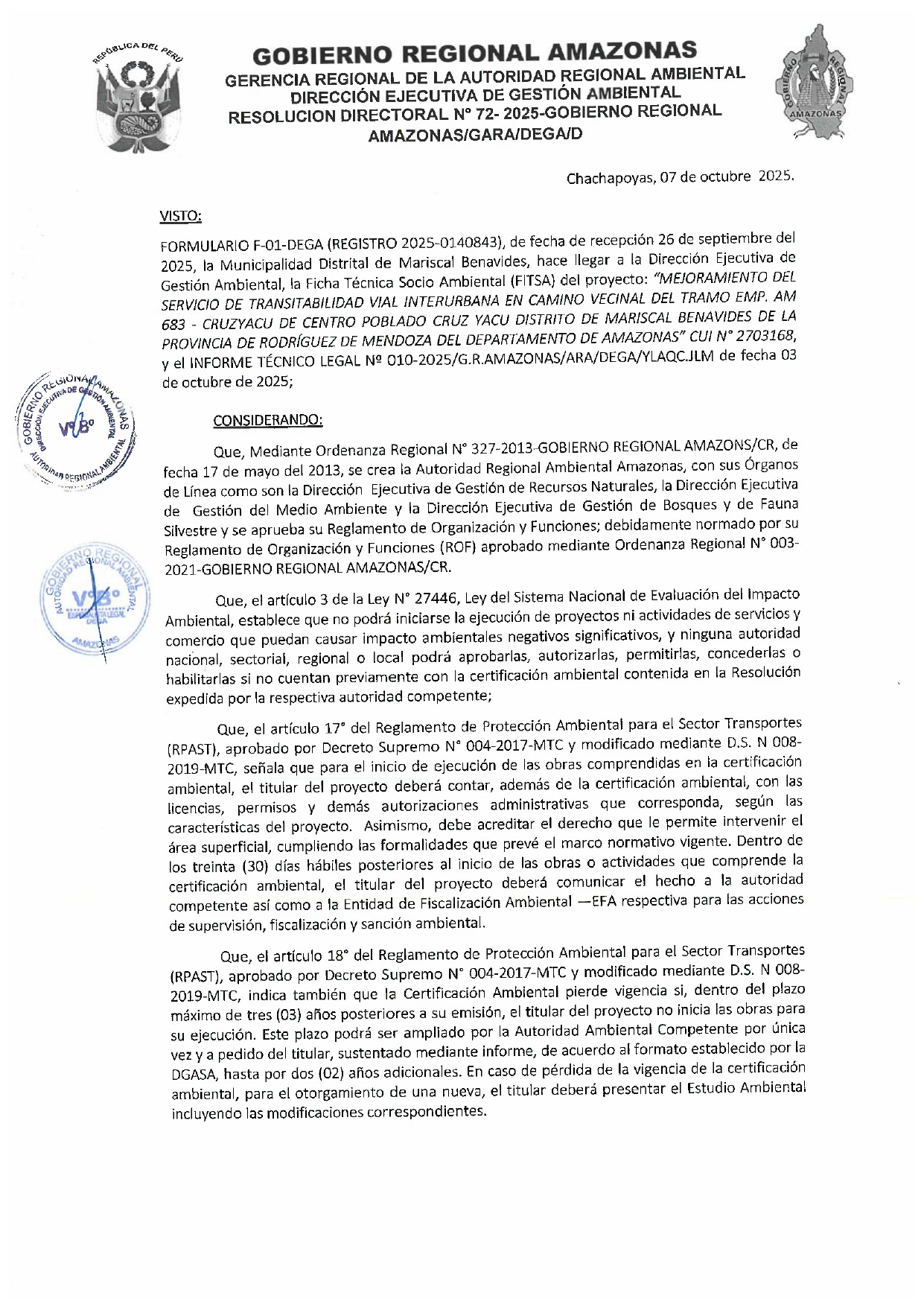 Esta Resolución Directoral tiene como antecedente al Formulario F.001-DEGA, presentado por la Municipalidad Distrital de Mariscal Benavides, el cual hizo llegar a la Dirección Ejecutiva de Gestión Ambiental (DEGA) del Gobierno Regional Amazonas la Ficha Técnica Socio Ambiental (FITSA) para el proyecto: " Mejoramiento del Servicio de Transitabilidad Vial Interurbana en Camino Vecinal del Tramo EMP. AM 683 – Cruzyacu de Centro Poblado Cruz Yacu, Distrito de Mariscal Benavides, Provincia de Rodríguez de Mendoza, Departamento Amazonas". El proyecto cuenta con el Código Único de Inversiones (CUI) 2703168.