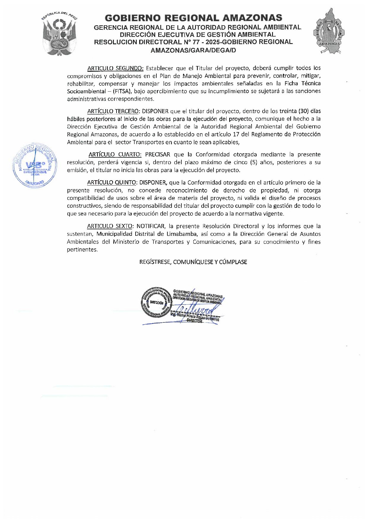 Esta Resolución Directoral tiene como antecedente al Formulario F.01-DEGA, presentado por la Municipalidad Distrital de Limabamba, el cual hizo llegar a la Dirección Ejecutiva de Gestión Ambiental (DEGA) del Gobierno Regional Amazonas la Ficha Técnica Socio Ambiental (FITSA) para el proyecto: "Creación del Servicio de Transito Peatonal Interurbano o Rural en el Camino de Herradura EMP. AM – 676 (D.V Challhuayacu) – Rio de Pesca (R 01 06 O 45), de 7 Puentes Peatonales Distrito de Limabamba, Provincia de Rodríguez de Mendoza, Departamento Amazonas". El proyecto cuenta con el Código Único de Inversiones (CUI) 2645489.