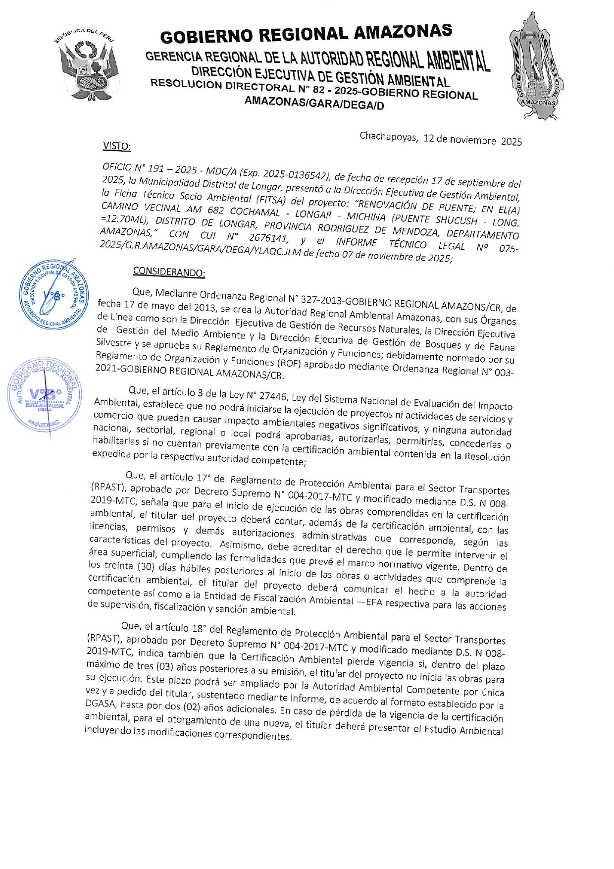 Esta Resolución Directoral tiene como antecedente el Oficio N° 191-2025/MDC/A, presentado por la Municipalidad Distrital de Longar, el cual hizo llegar a la Dirección Ejecutiva de Gestión Ambiental (DEGA) del Gobierno Regional Amazonas la Ficha Técnica Socio Ambiental (FITSA) para el proyecto: " Renovación de Puente; en El(La) Camino Vecinal AM 682 Cochamal – Longar – Michina (Puente Shucush – LONG.=12.70 ML), Distrito de Longar, Provincia Rodríguez de Mendoza, Departamento de Amazonas”. El proyecto cuenta con el Código Único de Inversiones (CUI) 2676141.