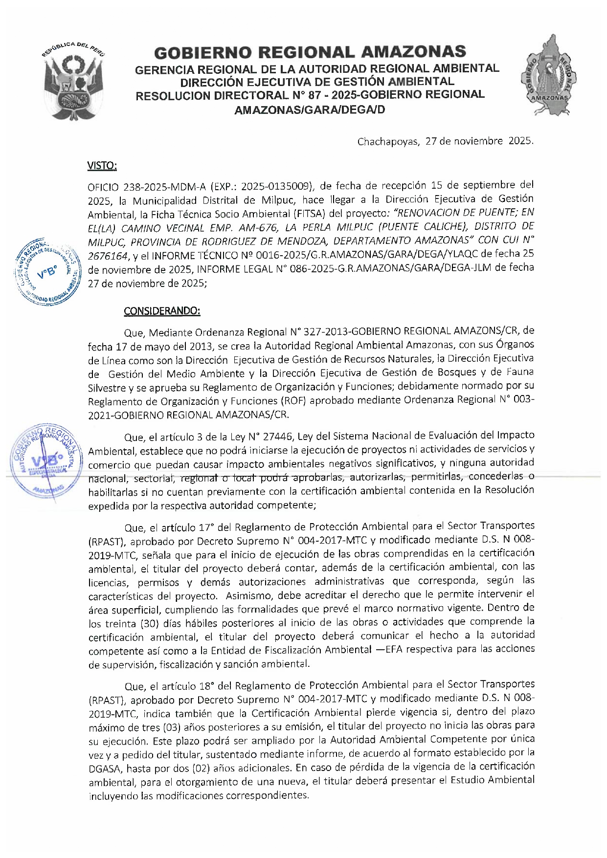 Esta Resolución Directoral tiene como antecedente al OFICIO 238-2025-MDM-A (Exp.2025-0135009), presentado por la Municipalidad Distrital de Milpuc, el cual hizo llegar a la Dirección Ejecutiva de Gestión Ambiental (DEGA) del Gobierno Regional Amazonas la Ficha Técnica Socio Ambiental (FITSA) para el proyecto: "Renovación de Puente; en El(La) Camino Vecinal EMP. AM 676, la Perla Milpuc (Puente Caliche), Distrito de Milpuc, Provincia Rodríguez de Mendoza, Departamento de Amazonas”. El proyecto cuenta con el Código Único de Inversiones (CUI) 2676164.