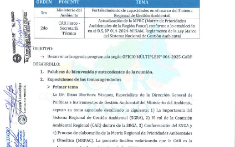 Acta de Reunión de la I Sesión Extraordinaria 2025 de la Comisión Ambiental Regional (CAR) Pasco