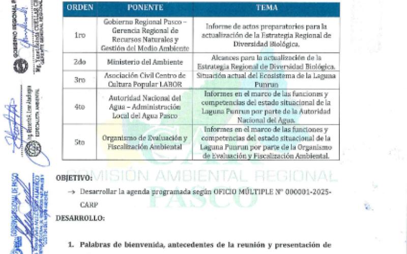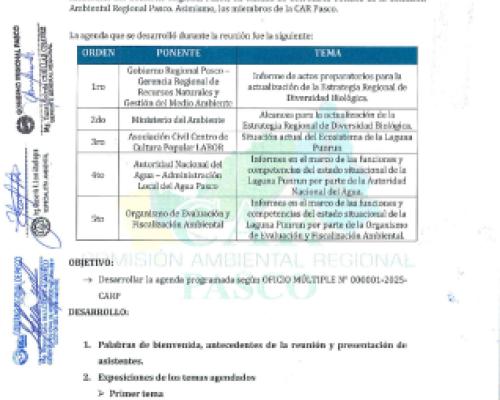Siendo jueves 11 de septiembre del 2025, a las 09:30 horas, estando presente la Mg. Yenet Soleda CUELLAR CHAVEZ presidenta de la Comisión Ambiental Regional de Pasco así también la Ing. Yesenia Tolentino Duran, Sub Gerente de Recursos Naturales y Gestión Ambiental del Gobierno Regional Pasco, en calidad de Secretaria Técnica de la Comisión Ambiental Regional Pasco.