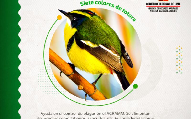 ¿Sabías que el siete colores de totora, es un ave que ayuda en el control biológico de plagas en los jumedales costeros. Se alimentan de insectos como tábanos, zancudos, libélulas, arañas, etc. Además es considerada como una de las aves más hermosas que cuenta nuestro país.