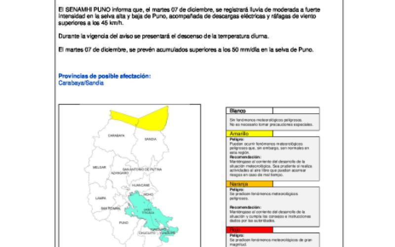 El SENAMHI PUNO informa que, el martes 07 de diciembre, se registrará lluvia de moderada a fuerte intensidad en la selva alta y baja de Puno, acompañada de descargas eléctricas y ráfagas de viento superiores a los 45 km/h. Durante la vigencia del aviso se presentará el descenso de la temperatura diurna.