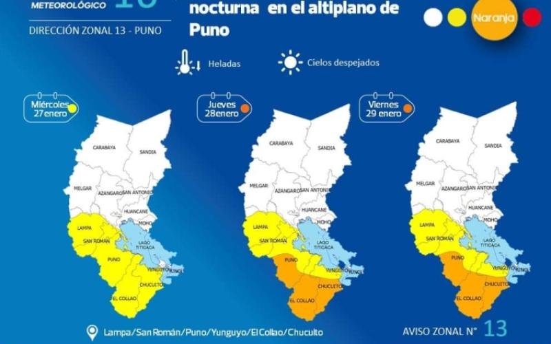 Descenso de temperatura nocturna en el altiplano de Puno, en las provincias de Lampa, San Román, Puno, Yunguyo, El Collao y Chucuito.