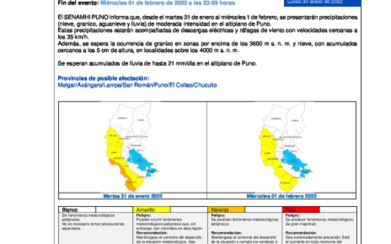 El SENAMHI PUNO informa que, desde el martes 31 de enero al miércoles 1 de febrero, se presentarán precipitaciones (nieve, granizo, aguanieve y lluvia) de moderada intensidad en el altiplano de Puno.