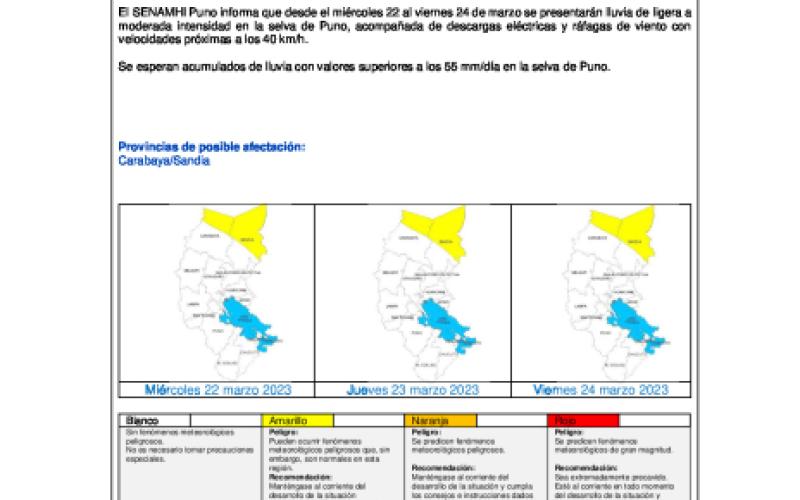 El SENAMHI Puno informa que desde el miércoles 22 al viernes 24 de marzo se presentarán lluvia de ligera a moderada intensidad en la selva de Puno, acompañada de descargas eléctricas y ráfagas de viento con velocidades próximas a los 40 km/h.