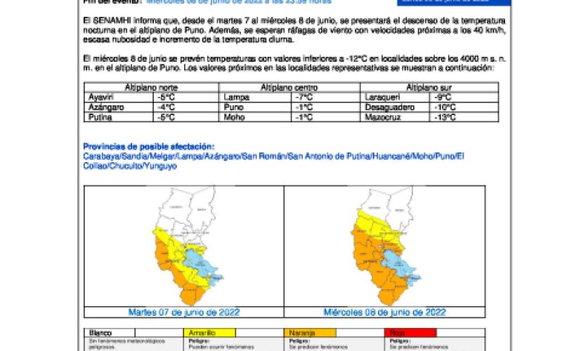 Aviso meteorológico N° 107 - 061 DZ13 - DESCENSO DE TEMPERATURA NOCTURNA EN EL ALTIPLANO DE PUNO