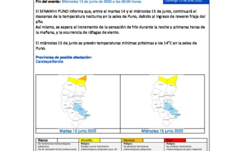 Aviso meteorológico N° 114 - 067 DZ13 - FRIAJE EN LA SELVA DE PUNO