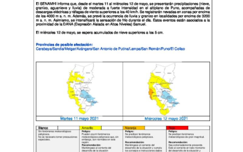 El SENAMHI informa que, desde el martes 11 al miércoles 12 de mayo, se presentarán precipitaciones (nieve, granizo, aguanieve y lluvia) de moderada a fuerte intensidad en el altiplano de Puno, acompañadas de descargas eléctricas y ráfagas de viento superiores a los 40 km/h. Se registrarán nevadas en zonas por encima de los 4000 m s. n. m. Además, se prevé la ocurrencia de lluvia y granizo en localidades por encima de 3200 m s. n. m. Asimismo, se intensificará la sensación de frío durante el día. Estos eventos están asociados a la proximidad de la DANA (Depresión Aislada en Altos Niveles) Samuel.