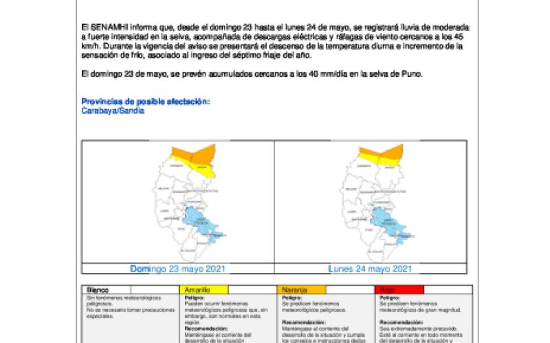 AVISO METEOROLOGICO N°105 - 067 - Lluvias en la selva de Puno del 23 de mayo al 24 de mayo 2021.