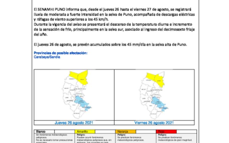 El SENAMHI PUNO informa que, desde el jueves 26 hasta el viernes 27 de agosto, se registrará lluvia de moderada a fuerte intensidad en la selva de Puno, acompañada de descargas eléctricas y ráfagas de viento superiores a los 45 km/h.