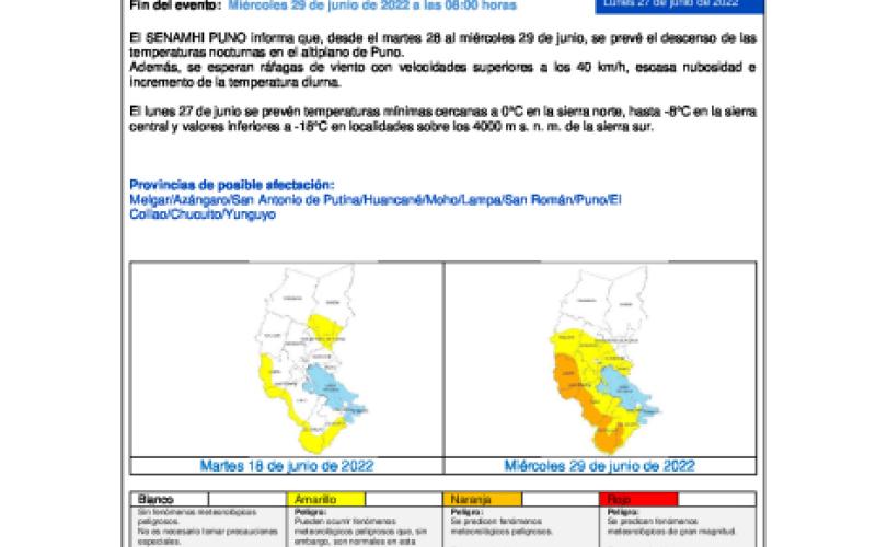 El SENAMHI PUNO informa que, desde el martes 28 al miércoles 29 de junio, se prevé el descenso de las temperaturas nocturnas en el altiplano de Puno.