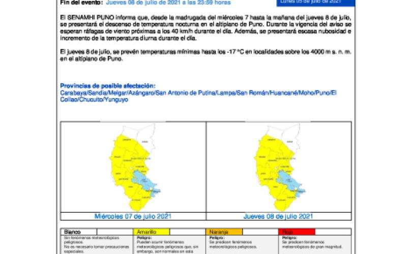 El SENAMHI PUNO informa que, desde la madrugada del miércoles 7 hasta la mañana del jueves 8 de julio, se presentará el descenso de temperatura nocturna en el altiplano de Puno. Durante la vigencia del aviso se esperan ráfagas de viento próximas a los 40 km/h durante el día. Además, se presentará escasa nubosidad e incremento de la temperatura diurna durante el día.