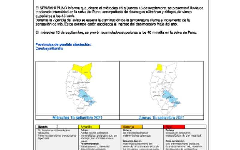 El SENAMHI PUNO informa que, desde el miércoles 15 al jueves 16 de septiembre, se presentará lluvia de moderada intensidad en la selva de Puno, acompañada de descargas eléctricas y ráfagas de viento superiores a los 45 km/h. Durante la vigencia del aviso se espera la disminución de la temperatura diurna e incremento de la sensación de frío. Estos eventos están asociados al ingreso del decimoctavo friaje del año.