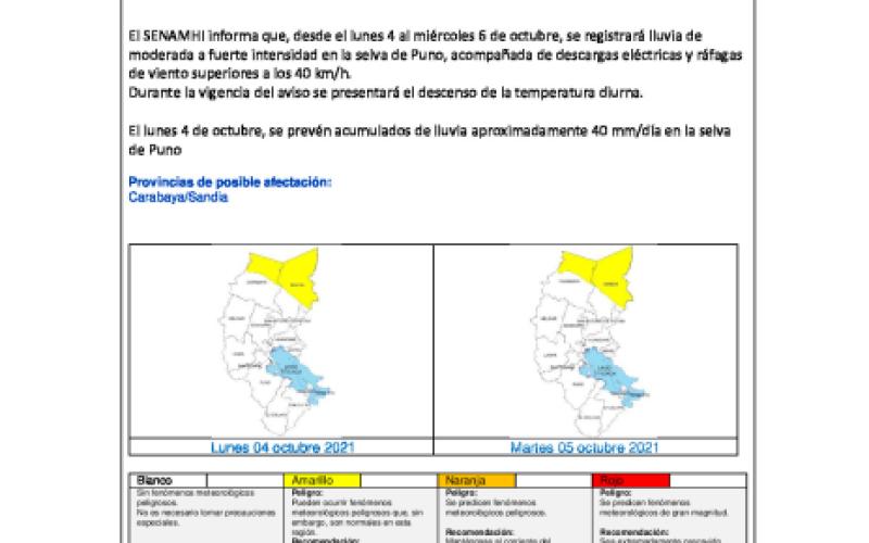 El SENAMHI informa que, desde el lunes 4 al miércoles 6 de octubre, se registrará lluvia de moderada a fuerte intensidad en la selva de Puno, acompañada de descargas eléctricas y ráfagas de viento superiores a los 40 km/h. Durante la vigencia del aviso se presentará el descenso de la temperatura diurna.
