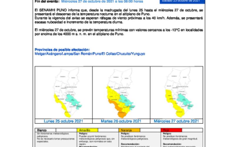 El SENAMHI PUNO informa que, desde la madrugada del lunes 25 hasta el miércoles 27 de octubre, se presentará el descenso de la temperatura nocturna en el altiplano de Puno. Durante la vigencia del aviso se esperan ráfagas de viento próximas a los 40 km/h. Además, se presentará escasa nubosidad e incremento de la temperatura diurna.