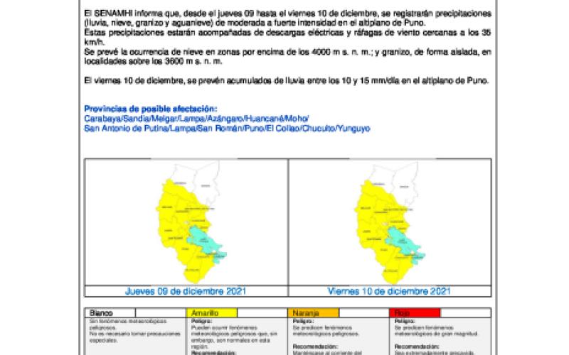 El SENAMHI informa que, desde el jueves 09 hasta el viernes 10 de diciembre, se registrarán precipitaciones (lluvia, nieve, granizo y aguanieve) de moderada a fuerte intensidad en el altiplano de Puno. Estas precipitaciones estarán acompañadas de descargas eléctricas y ráfagas de viento cercanas a los 35 km/h. Se prevé la ocurrencia de nieve en zonas por encima de los 4000 m s. n. m.; y granizo, de forma aislada, en localidades sobre los 3600 m s. n. m.