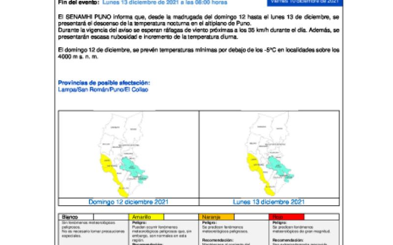 El SENAMHI PUNO informa que, desde la madrugada del domingo 12 hasta el lunes 13 de diciembre, se presentará el descenso de la temperatura nocturna en el altiplano de Puno. Durante la vigencia del aviso se esperan ráfagas de viento próximas a los 35 km/h durante el día. Además, se presentarán escasa nubosidad e incremento de la temperatura diurna.