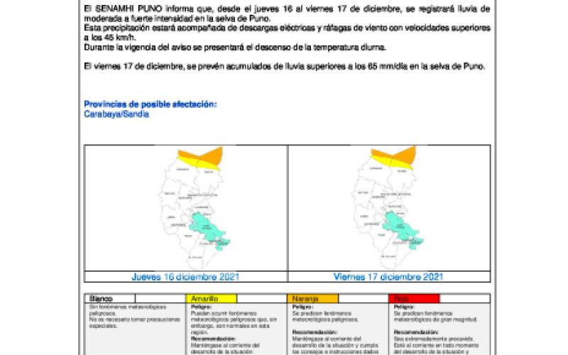 El SENAMHI PUNO informa que, desde el jueves 16 al viernes 17 de diciembre, se registrará lluvia de moderada a fuerte intensidad en la selva de Puno. Esta precipitación estará acompañada de descargas eléctricas y ráfagas de viento con velocidades superiores