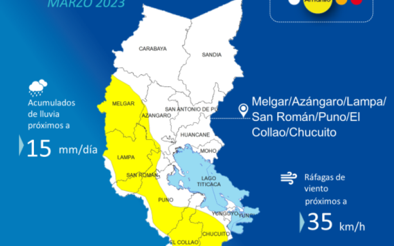 El SENAMHI Puno informa que el viernes 17 de marzo se presentarán precipitaciones (nieve, granizo, aguanieve y lluvia) de ligera a moderada intensidad en el altiplano de Puno. Estas precipitaciones estarán acompañadas de descargas eléctricas y ráfagas de viento con velocidades cercanas a los 35 km/h. Además, se espera la ocurrencia de granizo de forma localizada en zonas por encima de los 3800 m. s. n. m. y nieve