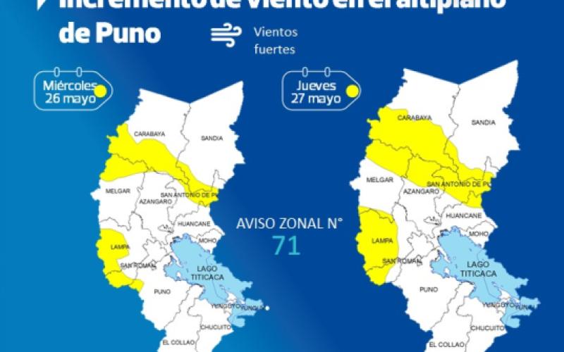 Mié, 26/05/2021 - 12:00 AVISO METEOROLOGICO PARA LA REGION DE PUNO. Autor Oficina regional del SENAMHI en Puno COMPATIR Incremento de viento en el altiplano de Puno del miércoles 26 al jueves 27 de mayo. Metadatos Mostrar el registro completo del ítem