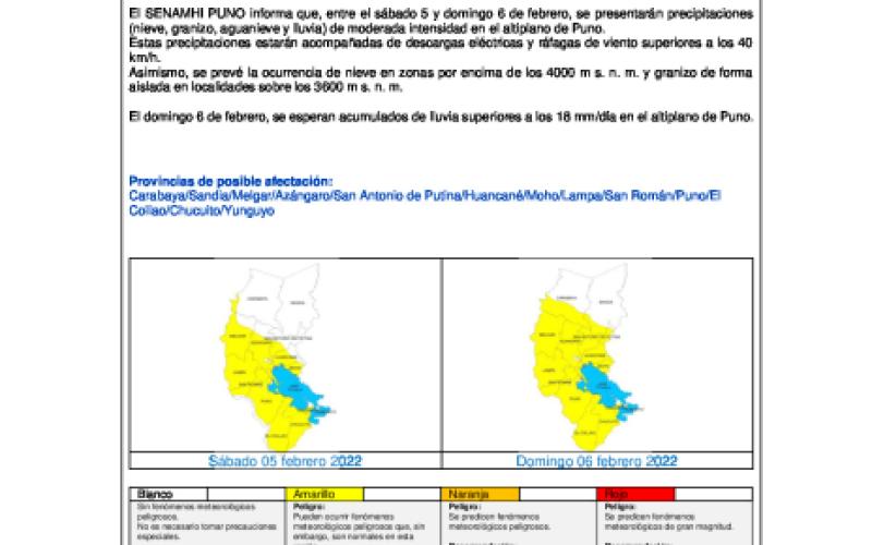 El SENAMHI PUNO informa que, entre el sábado 5 y domingo 6 de febrero, se presentarán precipitaciones (nieve, granizo, aguanieve y lluvia) de moderada intensidad en el altiplano de Puno.