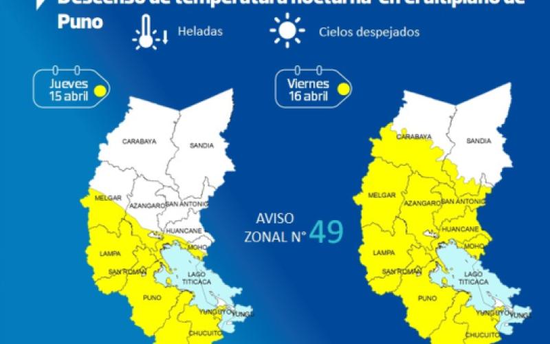 El SENAMHI informa que, desde el jueves 15 hasta el viernes 16 de abril, se presentará descenso de temperatura nocturna de ligera a moderada intensidad en el altiplano de Puno. Durante la vigencia del aviso se esperan ráfagas de viento próximas a los 35 km/h en horas de la tarde. Además, se presentará escasa nubosidad e incremento de la temperatura diurna.