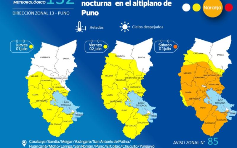 El SENAMHI PUNO informa que, desde la madrugada del jueves 1 hasta la noche del sábado 3 de julio, se registrará el descenso de la temperatura nocturna en el altiplano de Puno. Durante la vigencia del aviso se esperan ráfagas de viento próximas a los 30 km/h en horas de la tarde. Además, se presentará escasa nubosidad e incremento de la temperatura durante el día.
