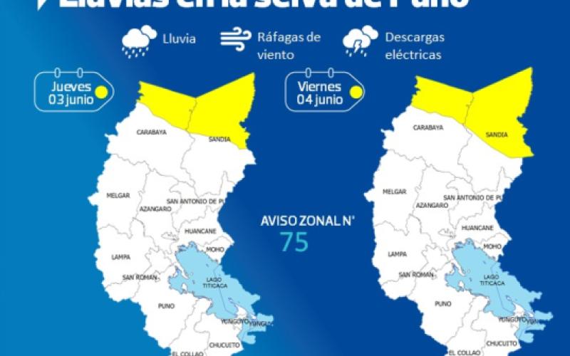 AVISO METEOROLOGICO PARA LA REGION DE PUNO. LLUVIAS EN LA SELVA DE PUNO DEL 03 AL 04 DE JUNIO 2021