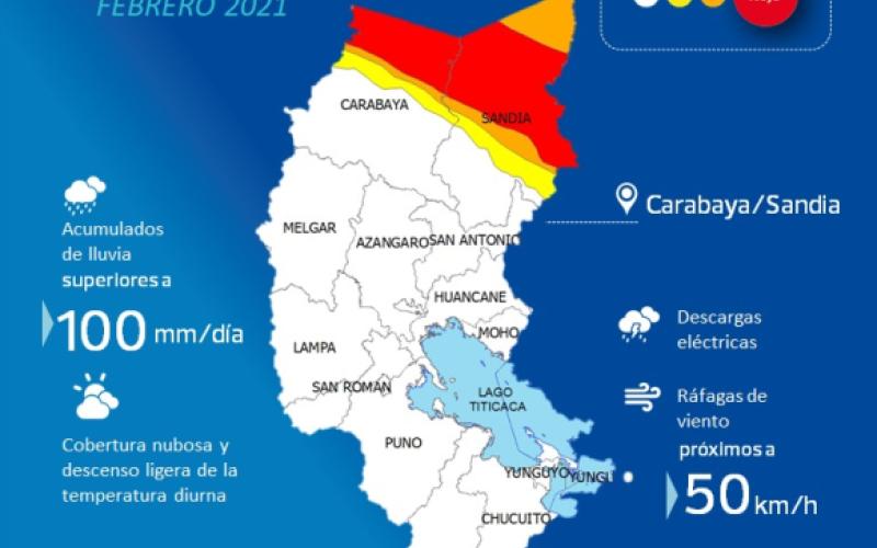 Mar, 09/02/2021 - 12:00 AVISO METEOROLOGICO PARA LA REGION DE PUNO. Lluvias en la Selva de Puno Autor Oficina regional del SENAMHI en Puno COMPATIR Lluvias en la Selva de Puno el miércoles 10 de febrero. Metadatos Mostrar el registro completo del ítem