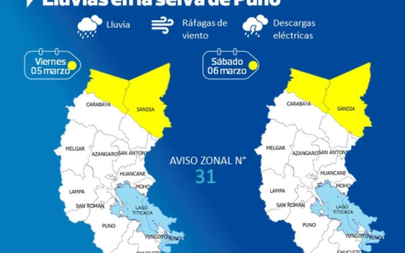Lluvias en la Selva de Puno, del viernes 05 de marzo al sábado 06 de marzo.